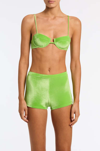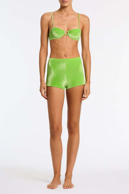 A high waist short in green velvet. Features an elasticized band that sits close to the waist.