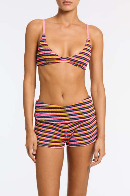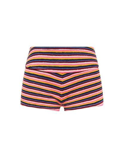 A multicoloured stripe high waist short in finely knitted crochet. Features a folded band that sits close to the waist.