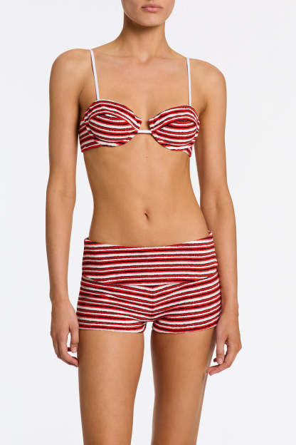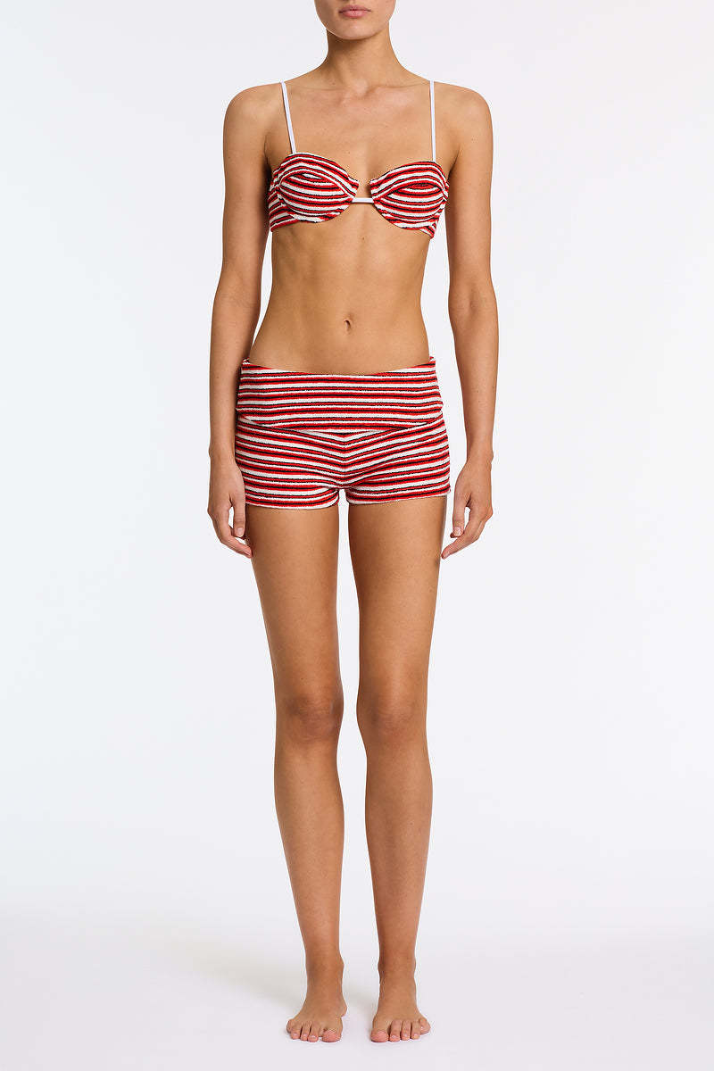 A high waist short in red and white terry stripe. Features a folded band that sits close to the waist.