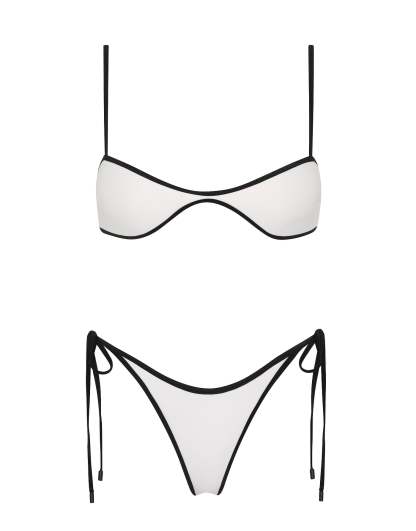 A scoop crop bikini top in white neoprene with black piping and matching tie-side bottoms. Ruched side detailing with adjustable shoulder straps and back clasp fastening. Choose from either cheekiest or cheeky bottoms. This bikini also comes with a neoprene back pack.
