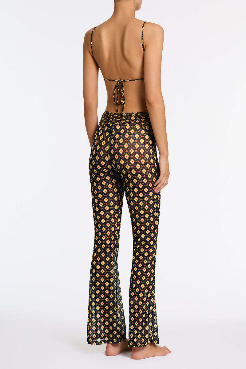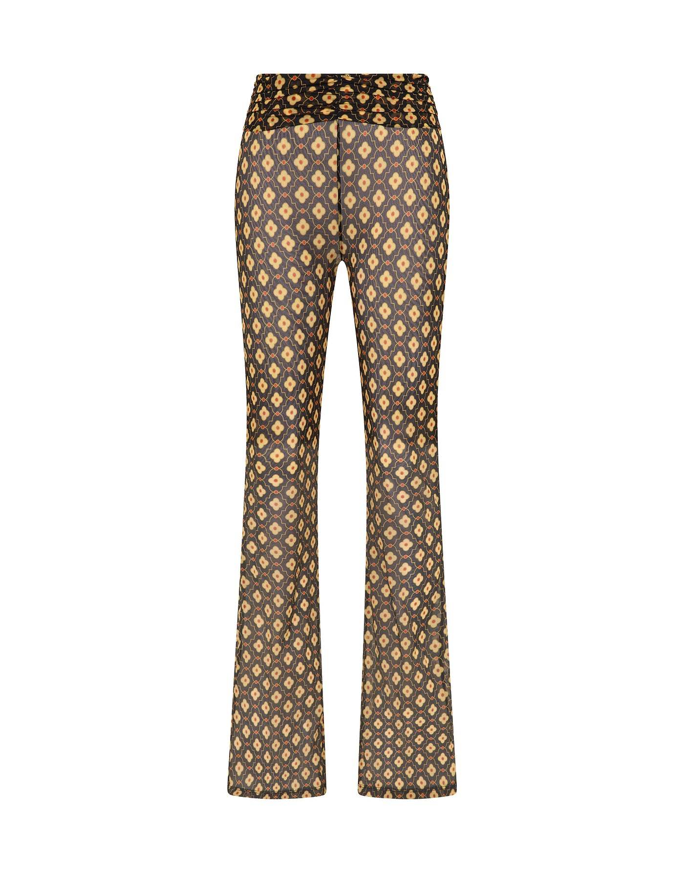 High waisted semi-sheer flare pants in a retro geometric print. Features an elasticized waist with textured detail.