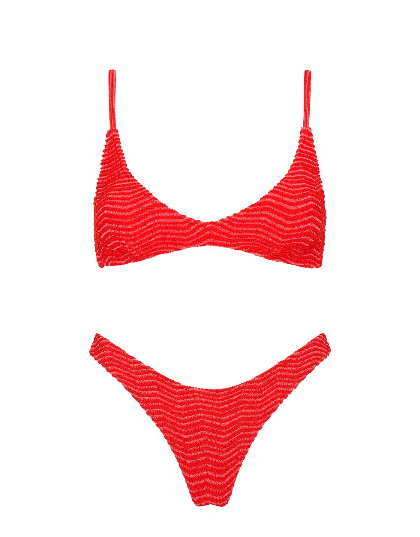 A textured deep scoop crop bikini top in red with matching mid-high waist bottoms. Strappy crop top with adjustable shoulder straps and back clasp fastening. Choose from either cheekiest, cheeky or normal bottom for a little more coverage. This bikini also comes with a neoprene zip bag.