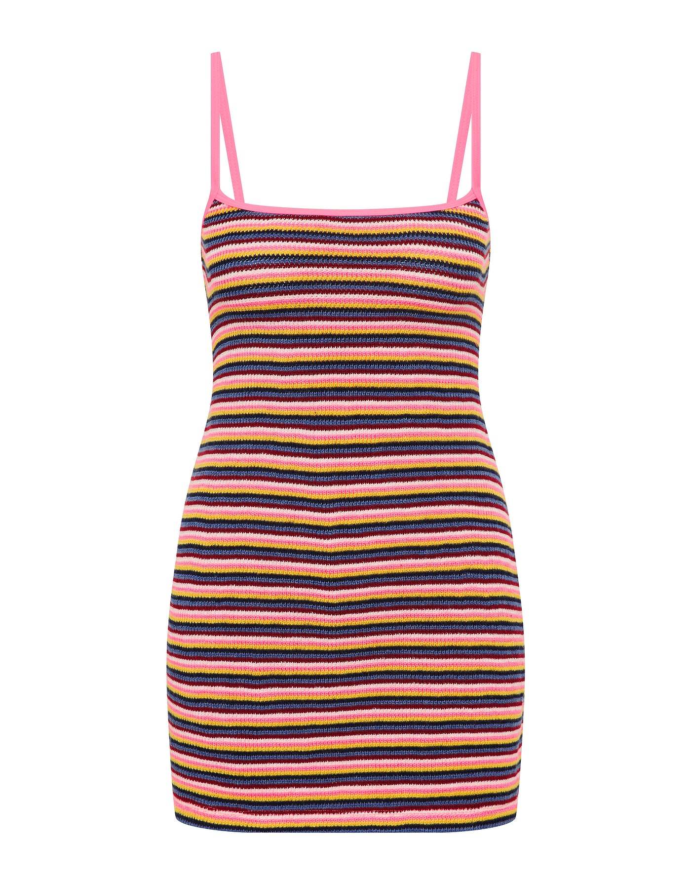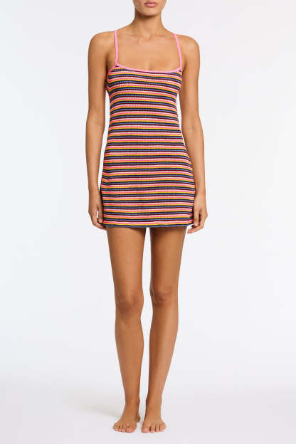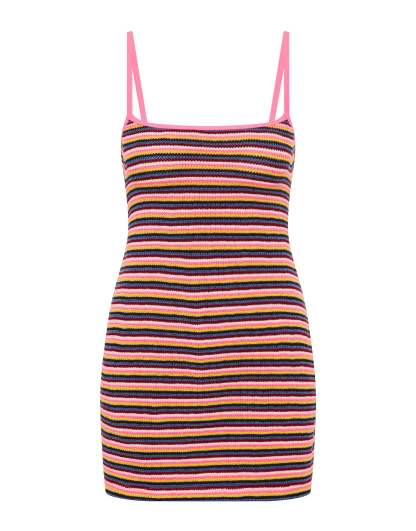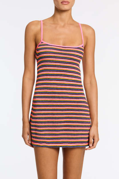 A multicoloured stripe mini dress in finely knitted crochet stripe featuring an open back with adjustable self-tie fastening. Dress available in XS/S or M/L.