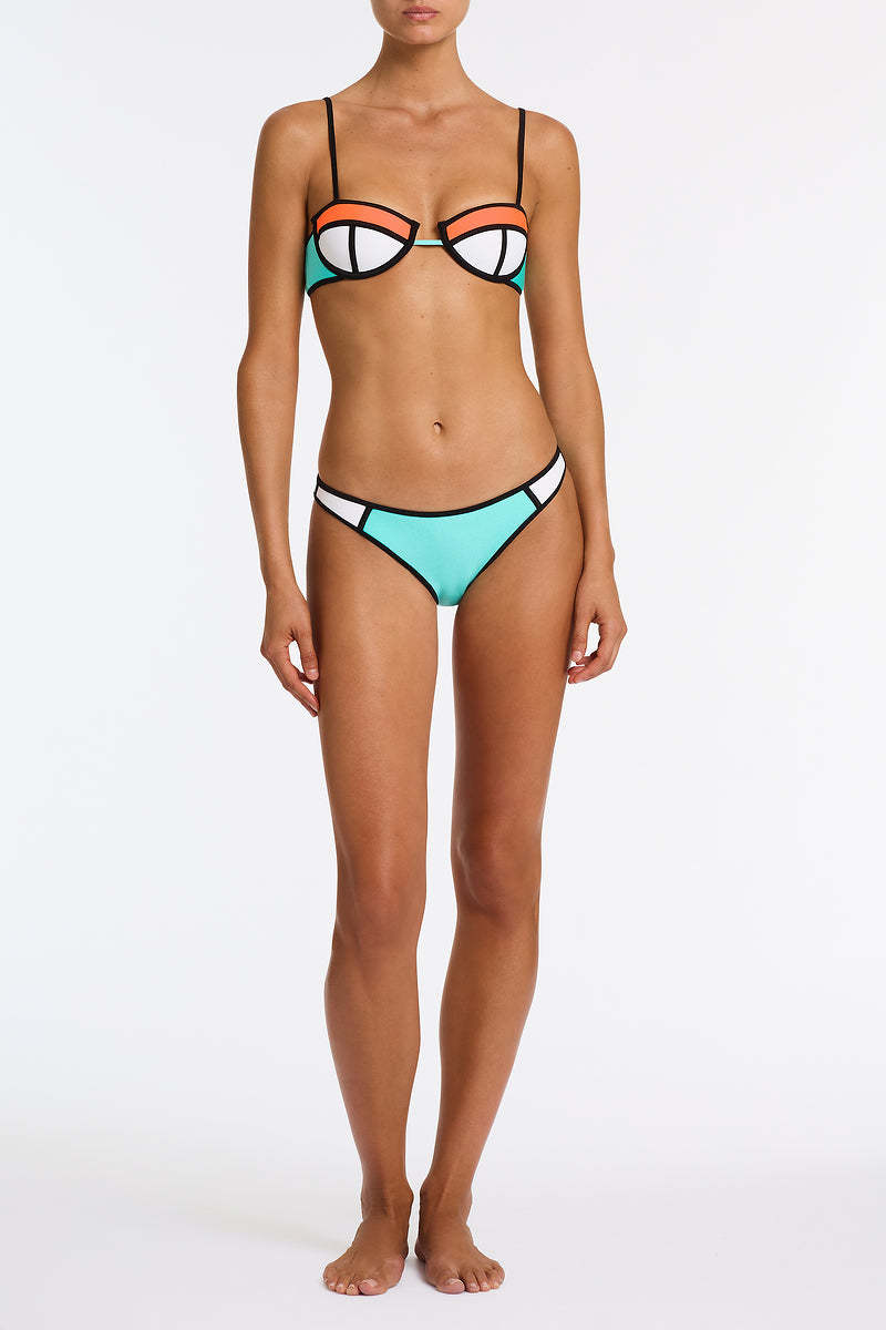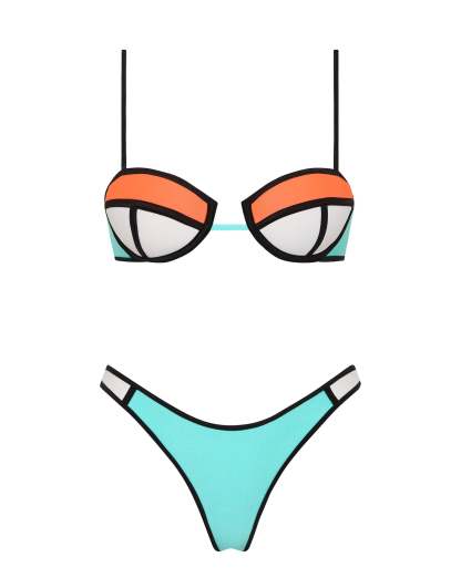 A bra style top in multicolour neoprene featuring a non-padded cup with adjustable shoulder straps and back clasp fastening and matching mid-high waist bottoms. This bikini also comes with a neoprene back pack.