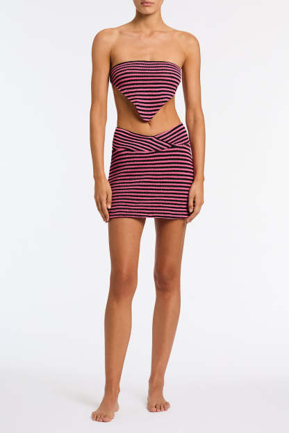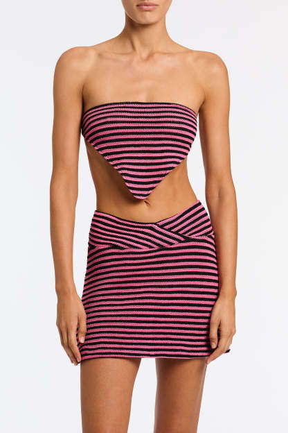 A bandana style top in pink and black finely knitted crochet stripe. Can also be worn as a head scarf. Features a self-tie back. Top available in XS/S or M/L.