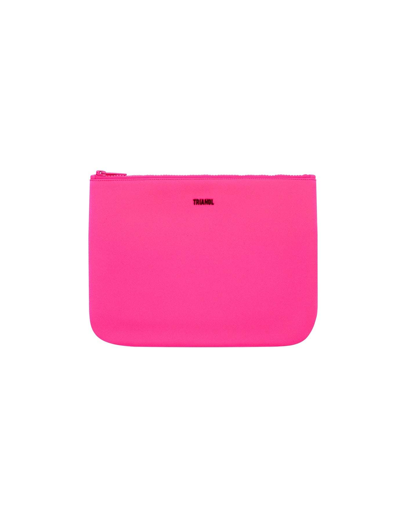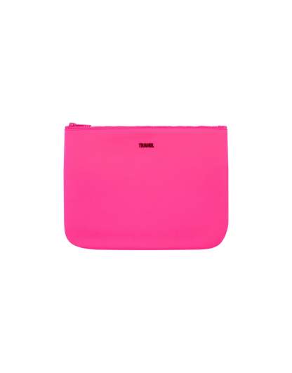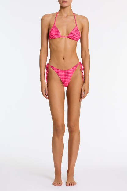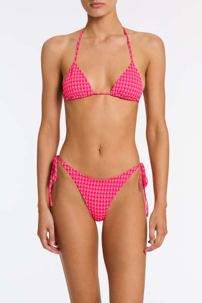 A textured tie-side bikini in pink. Fully adjustable triangle top and bottoms with self-tie fastenings. Choose from either cheekiest or cheeky bottoms. This bikini also comes with a neoprene zip bag.