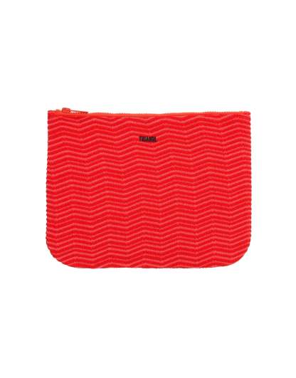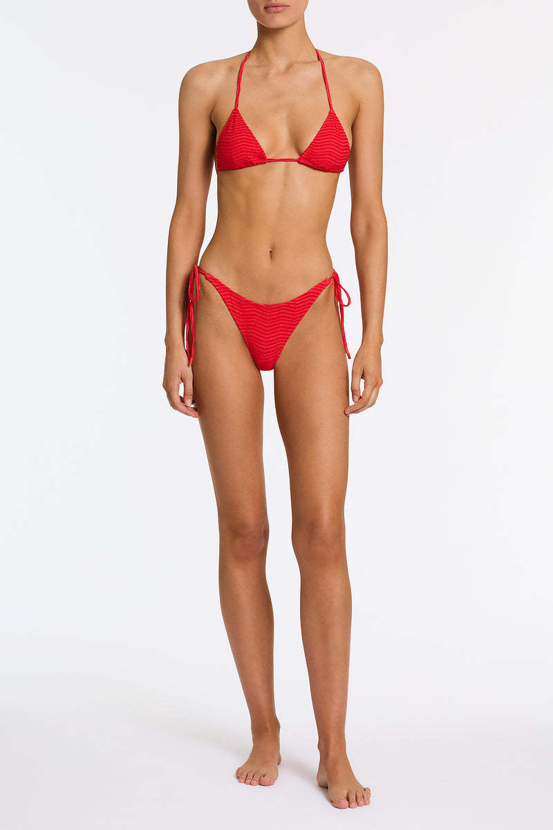 A textured tie-side bikini in red. Fully adjustable triangle top and bottoms with self-tie fastenings. Choose from either cheekiest or cheeky bottoms. This bikini also comes with a neoprene zip bag.