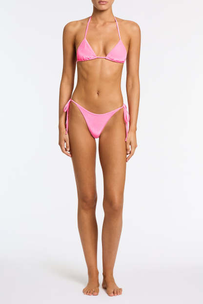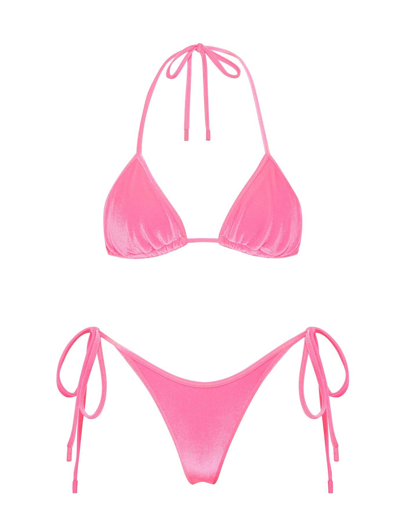 A tie-side bikini in pink velvet. Fully adjustable triangle top and bottoms with self-tie fastenings. Choose from either cheekiest or cheeky bottoms. This bikini also comes with a neoprene zip bag.